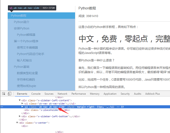 f.write(html)第二步就是把页面左侧所有 URL 解析出来。采用同样的方式,找到 左侧菜单标签 <ul class="uk-nav uk-nav-side">