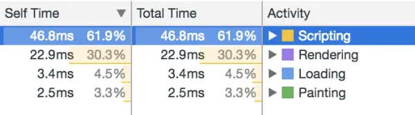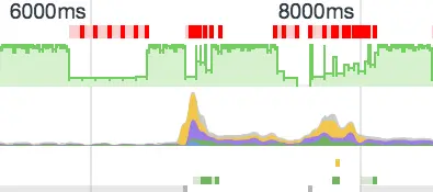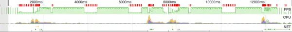 最上面一栏是帧率,顶点表示60fps,红色方格表示渲染时间比较长的帧,Chrome把这种情况叫做jank。可以看到上面有3个比较大的低谷,这并不是异常的失帧,这是Chrome检测到页面没有动了,idle空闲了,自动降低帧率。第二栏是CPU,黄色的为script,紫色的是CSS,蓝色是html,可以看到往往script占了比较高的CPU。关于timeline更详细的说明,可以查看chrome的文档。