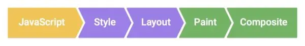 60fps就要求1帧的时间为1s / 60 = 16.67ms。浏览器显示页面的时候,要处理js逻辑,还要做渲染,每个执行片段不能超过16.67ms。实际上,浏览器内核自身支撑体系运行也需要消耗一些时间,所以留给我们的时间差不多只有10ms。这10ms里面需要做一些什么事情?在Chrome的开发者文档Rendering Performance里面提到这个流程: