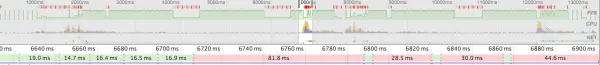 可以看到有好几帧都超过了16.67ms,其中有一帧甚至达到了81.8ms,所以难怪卡得那么厉害。我们重点看一下这一帧里面发生了什么。