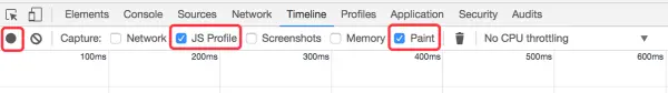 打开timeline的标签,勾上js profile和paint这两个选项,然后点击左边的记录按钮: