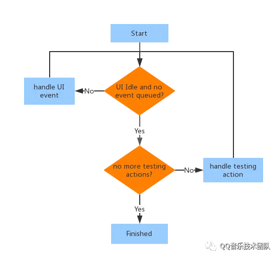 本文开头提到Espresso其中一个特点,无需主动写Sleep等待UI事件的执行和UI的绘制。原因是,Espresso的用例运行过程是只有当UI线程IDLE和UI队列没有需要执行的事件时,Espresso的测试代码才会被执行。使用方无需写Sleep逻辑等待UI绘制完成。以下是Espresso测试用例执行简易的流程图,帮助理解: