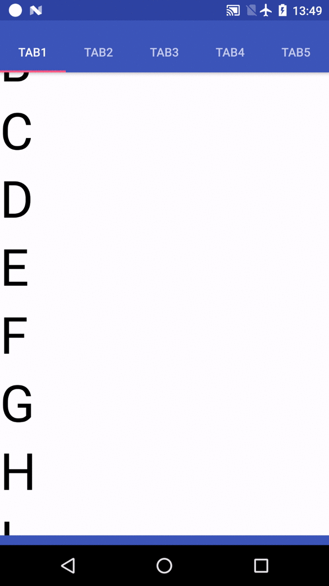 注意点:可以看到TabLayout没有设置app:layout_scrollFlags属性,原因是我只希望ToolBar进行滑动隐藏,TabLayout只是跟随ToolBar滑动不隐藏.(看不懂文字的可以看gif图),想要让TabLayout也隐藏加上app:layout_scrollFlags属性.
