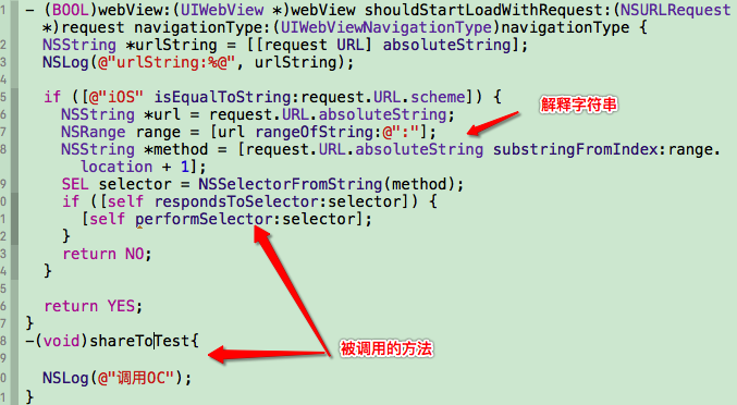 实现以上webView的代理方法,当webView每次开始加载URL时会进入这个方法,我们便可以在这个方法实现JS调用OC。