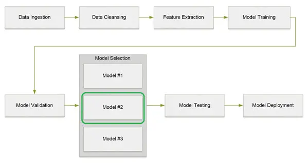 机器学习数据流水线所用的方法都是类似的。下图展示了在机器学习流水线处理中涉及到的不同步骤。