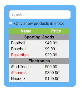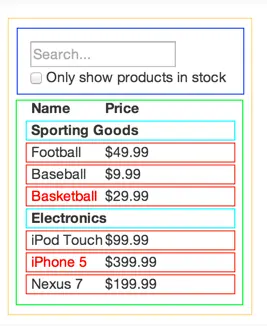 FilterableProductTable (orange)包含了整个样例SearchBar (blue)接收所有用户输入,包括输入框的输入和复选框的勾选ProductTable (green)基于用户的输入显示和过滤数据集ProductCategoryRow (turquoise)显示每个分类的标题ProductRow (red)显示每一种产品的信息