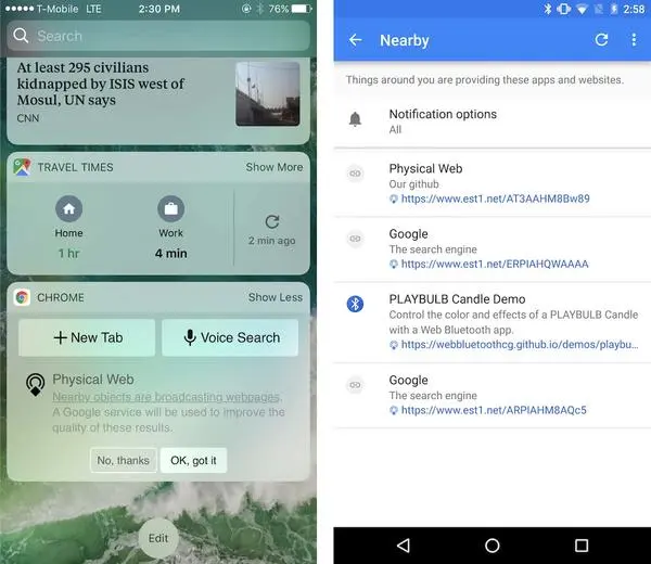 当你靠近蓝牙设备时,会弹出通知 。点击就可以打开对应的url页面。Physical Web已经开始在Chrome 49版本支持,在Android KitKat(4.4)版本开始的原生支持