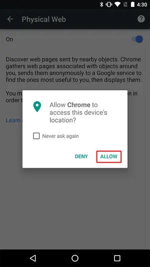 在Android(6.0)开始,Physical Web是在运行时获取位置使用权限。