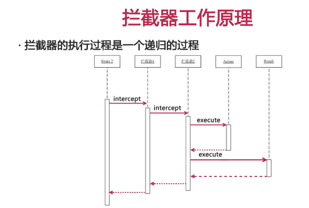 当Struts在执行一个action的时候,会在action执行之前去执行一些拦截器,如果有多个拦截器会依次进行执行。