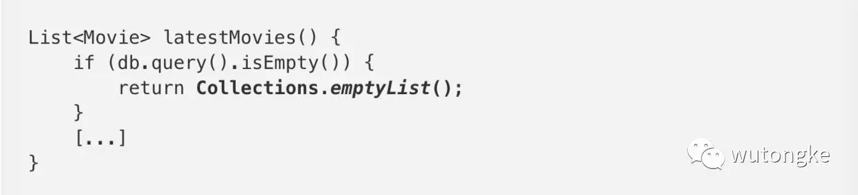 如果有一个方法的返回值类型是List/collection,不要返回null,可以返回一个空collection: