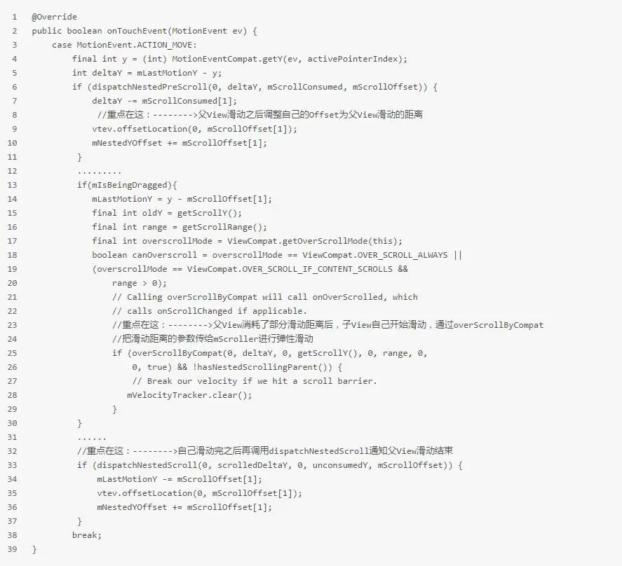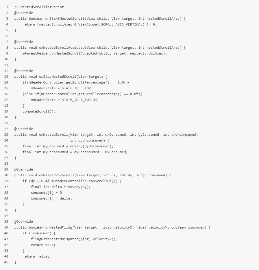 大家仔细看我在代码里加的注释,需要关心的就是父View在此时需要决定是否跟随子View滑动,看看父View的实现: