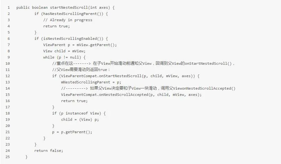 首先在子View滑动还未开始之前将调用startNestedScroll,对应NestedScrollView中的ACTION_DOWN: