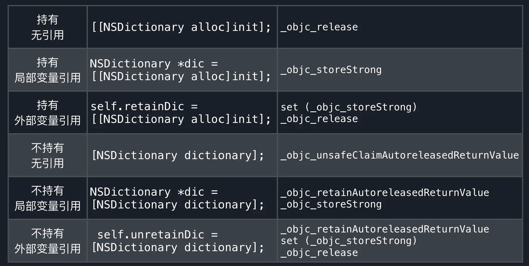 上文__strong的实现中我们提到,对于自己不持有的对象,系统会自动插入的一个命令objc_retainAutoreleasedReturnValue,与之对应的还有objc_retainAutoreleasedReturnValue objc_autoreleaseReturnValue.更详细的优化命令如下图: