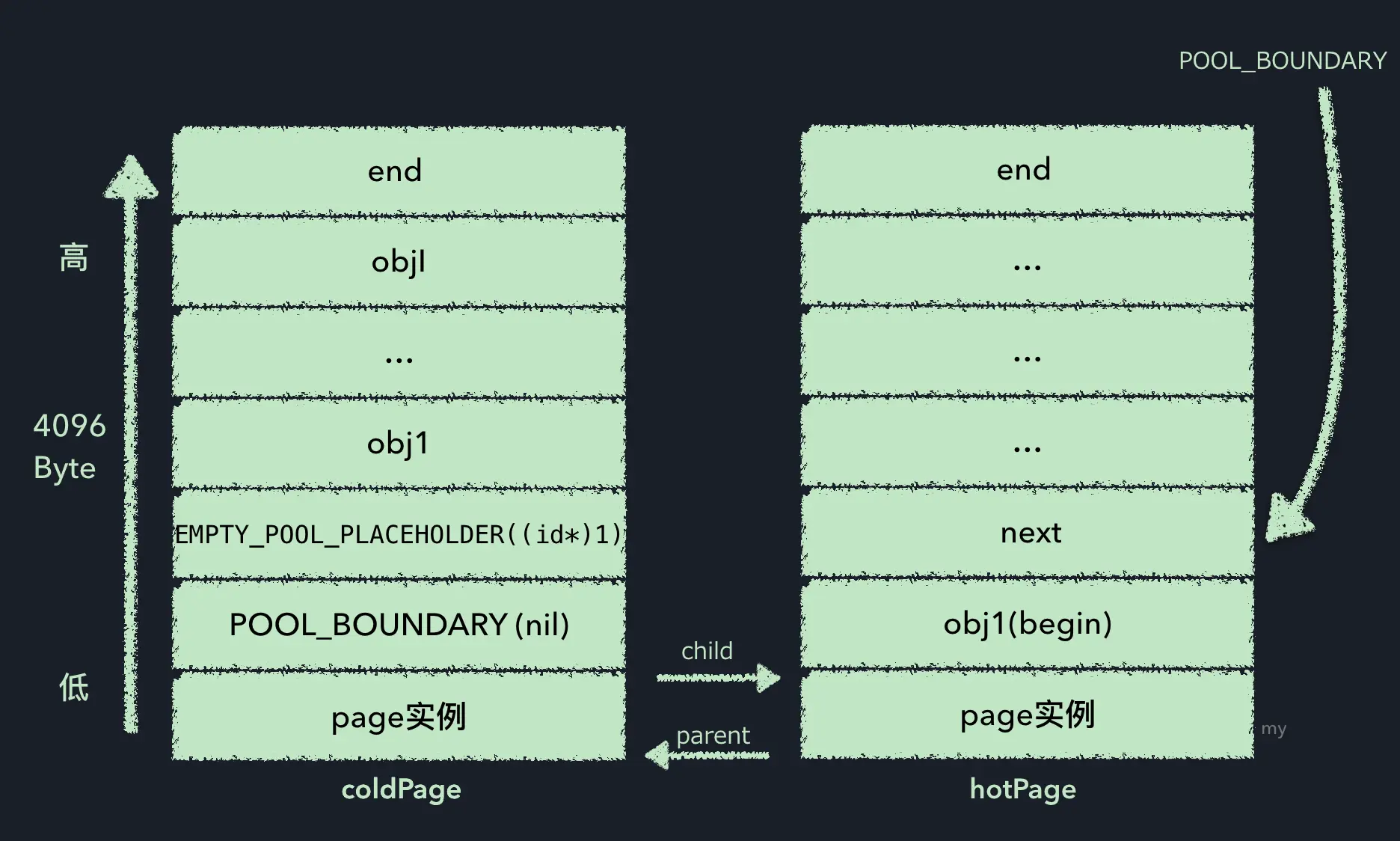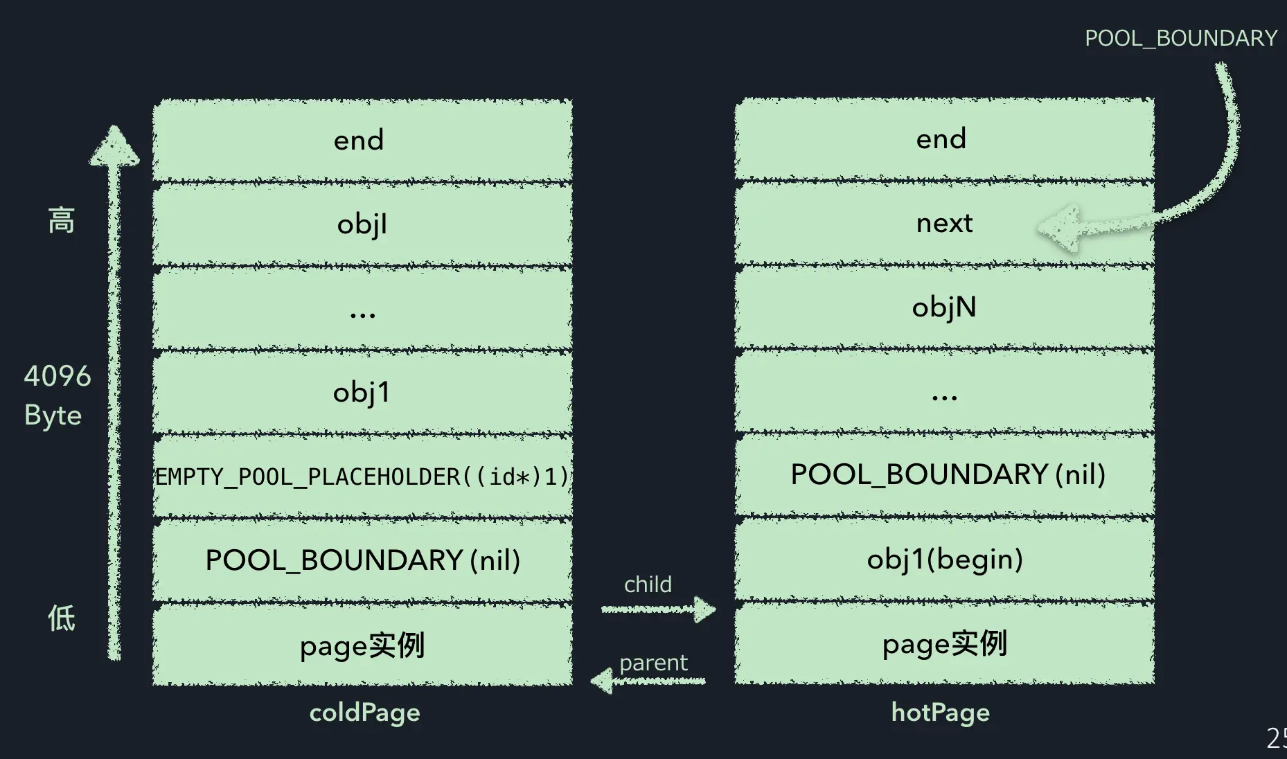 当插入对象时,会在next指针位置首先插入一个POOL_BOUNDARY对象(一个nil对象)作为标示,然后添加实例对象,并在末尾处更新next指针,使其指向下一个add进来的对象的位置,也就是下一个POOL_BOUNDARY对象了,然后返回插入哨兵对象的地址.