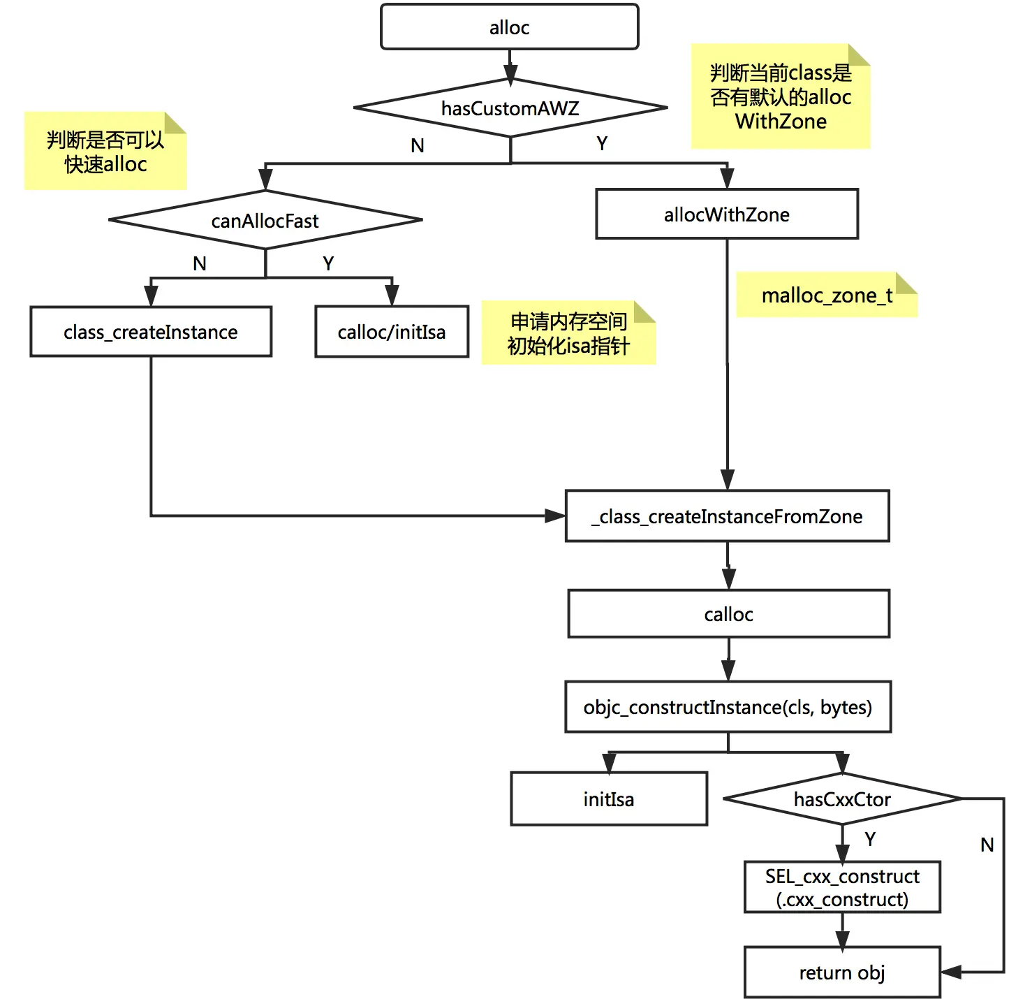 - 某个条件触发,创建了该对象,初始化isa指针,为之分配了内存