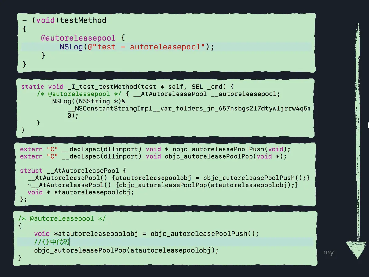 通过clang重新文件之后,可以看到autoreleasepool被转换为两个命令objc_autoreleasePoolPush和objc_autoreleasePoolPop,而查阅源码,会发现,这两个命令都是基于AutoreleasePoolPage的封装.