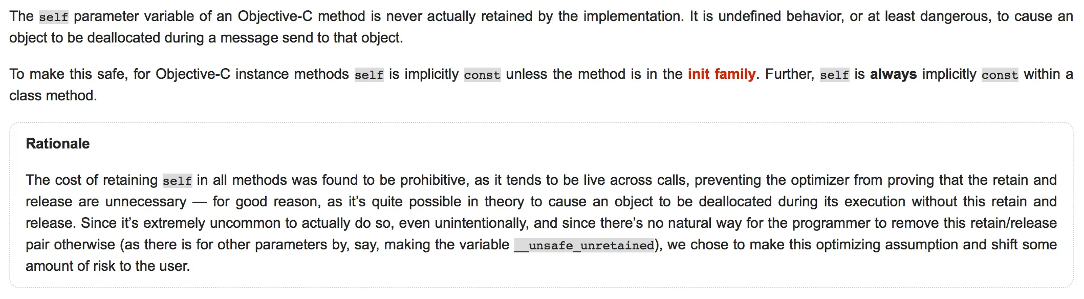 现在已经很少显式声明unsafe_unretained属性的变量,但值得注意的是,在ARC环境下,self并不会被retain和release,它其实是unsafe_unretained,生命周期全由它的调用方来保证.