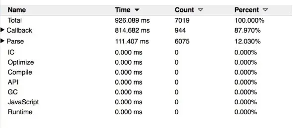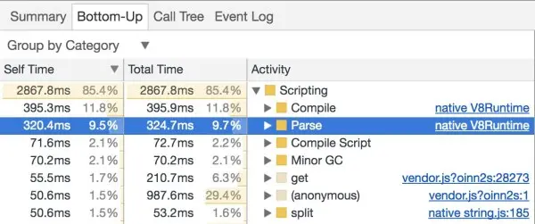 打开 Timeline( Performance panel ) > Bottom-Up/Call Tree/Event Log 就会显示出当前网站在语法解析/编译上的时间占比。如果你希望得到更完整的信息,那么可以打开 V8 的 Runtime Call Stats。在 Canary 中,其位于 Timeline 的 Experims > V8 Runtime Call Stats 下。