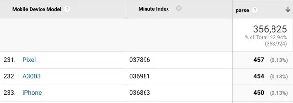 我们还可以使用 Nolan Lawson 推荐的User Timing API来评估语法解析的时间。不过这种方式可能会受 V8 预解析过程的影响,我们可以借鉴 Nolan 在 optimize-js 评测中的方式,在脚本的尾部添加随机字符串来解决这个问题。我基于 Google Analytics 使用相似的方式来评估真实用户与设备访问网站时候的解析时间:
