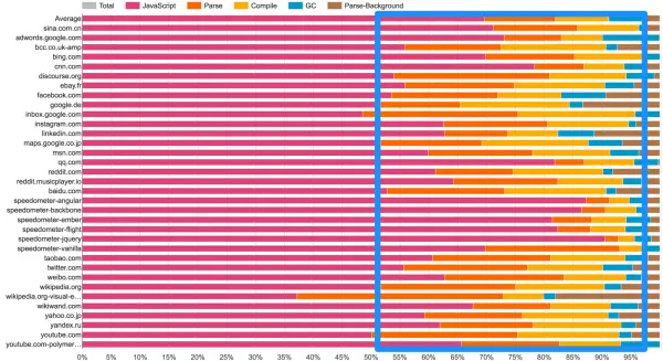 上图是我们使用 Chrome Canary 内置的 V8 RunTime Call Stats 对于某个网站的分析结果;需要注意的是桌面浏览器中语法解析与编译占用的时间还是蛮长的,而在移动端中占用的时间则更长。实际上,对于 Facebook, Wikipedia, Reddit 这些大型网站中语法解析与编译所占的时间也不容忽视:
