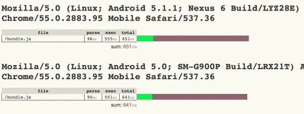 随着移动端浪潮的涌来,我们不得不面对一个残酷的事实:移动端对于相同包体的解析与编译过程要花费相当于桌面浏览器2~5倍的时间。当然,对于高配的 iPhone 或者 Pixel 这样的手机相较于 Moto G4 这样的中配手机表现会好很多;这一点提醒我们在测试的时候不能仅用身边那些高配的手机,而应该中高低配兼顾: