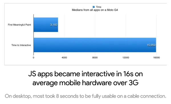 底会对其他网站造成什么样的影响呢?对于这个问题我也很好奇,于是我花费了两个月的时间对于超过 6000 个网站进行分析;这些网站囊括了 React,Angular,Ember,Vue 这些流行的框架或者库。大部分的测试是基于 WebPageTest 进行的,因此你可以很方便地重现这些测试结果。光纤接入的桌面浏览器大概需要 8 秒的时间才能允许用户交互,而 3G 环境下的 Moto G4 大概需要 16 秒 才能允许用户交互。