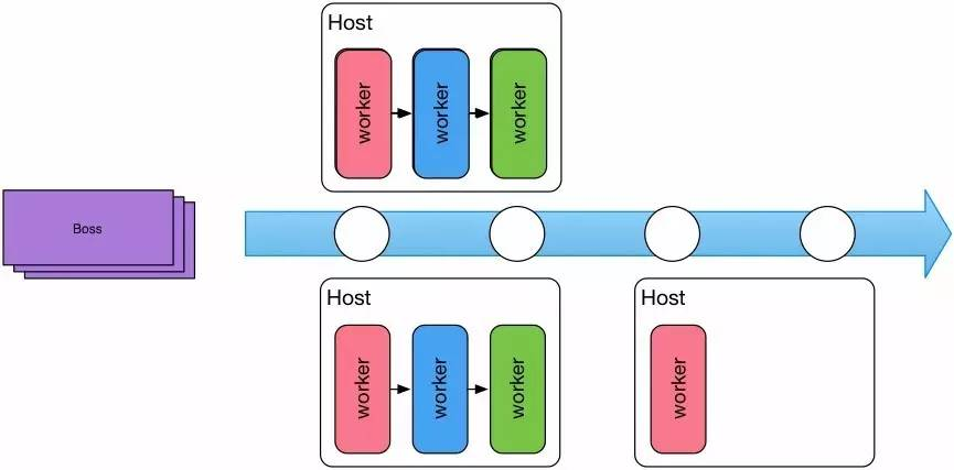 为了让Task Center能够横向扩展,避免单点问题,我们对第一代任务系统做了一次革命性的重构。从需求的角度去设计,很快想到了工厂的流水线模式。所有的任务相当于流水线的待加工产品,Boss负责接收未加工的任务,并把任务放入流水线MQ上。处理任务的Worker从流水线(MQ)中获取自己的任务并执行,执行完成后再放回流水线中去,下一个Worker继续处理任务。