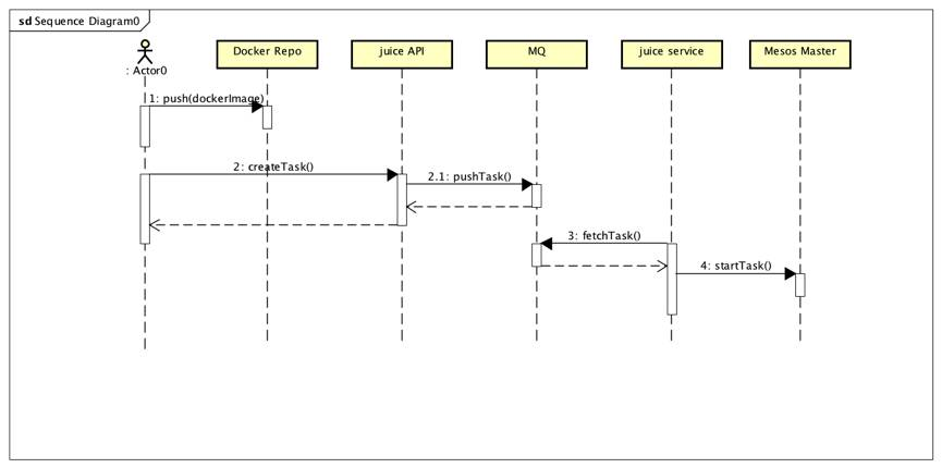 Juice目前只支持能运行在Docker内的任务。如果需要通过它调度任务,要提供一个能够运行的Docker镜像名称。通过Restful API(其API结构类似于Mesos的另一个框架Marathon),就能在规定的服务器集群中运行你的任务,是不是很酷呢?