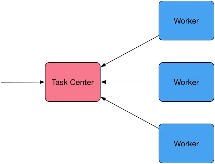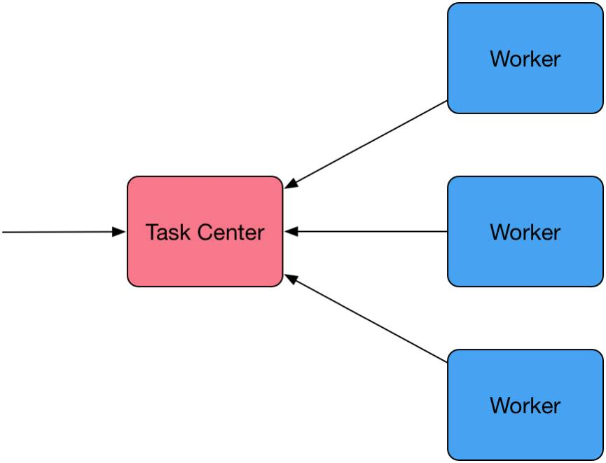 第一代任务系统出现在2010年。那时候任务数量还比较少,所以结构也简单。它由一个 Task Center和若干个Woker组成,架构如下图: