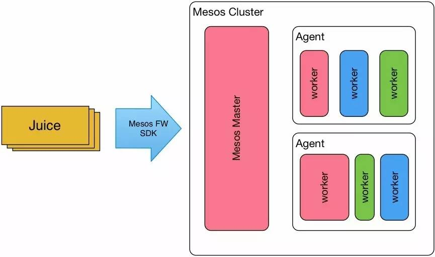我们的主角——Juice就是具有这样能力的基于Mesos框架的开源任务调度系统(名称的由来只是因为我们的开发人员,在开发时喜欢喝果汁而命名)。它的基本思想是:在获取到任务需求后,通过Mesos框架的API通知Mesos需要运行的任务资源。比如要执行转码任务,需要8核的CPU、4G的内存和50G的存储空间,Mesos会在相应的集群内寻找合适的服务器资源执行任务,任务执行成功或失败Mesos也会通知框架并得到记录。