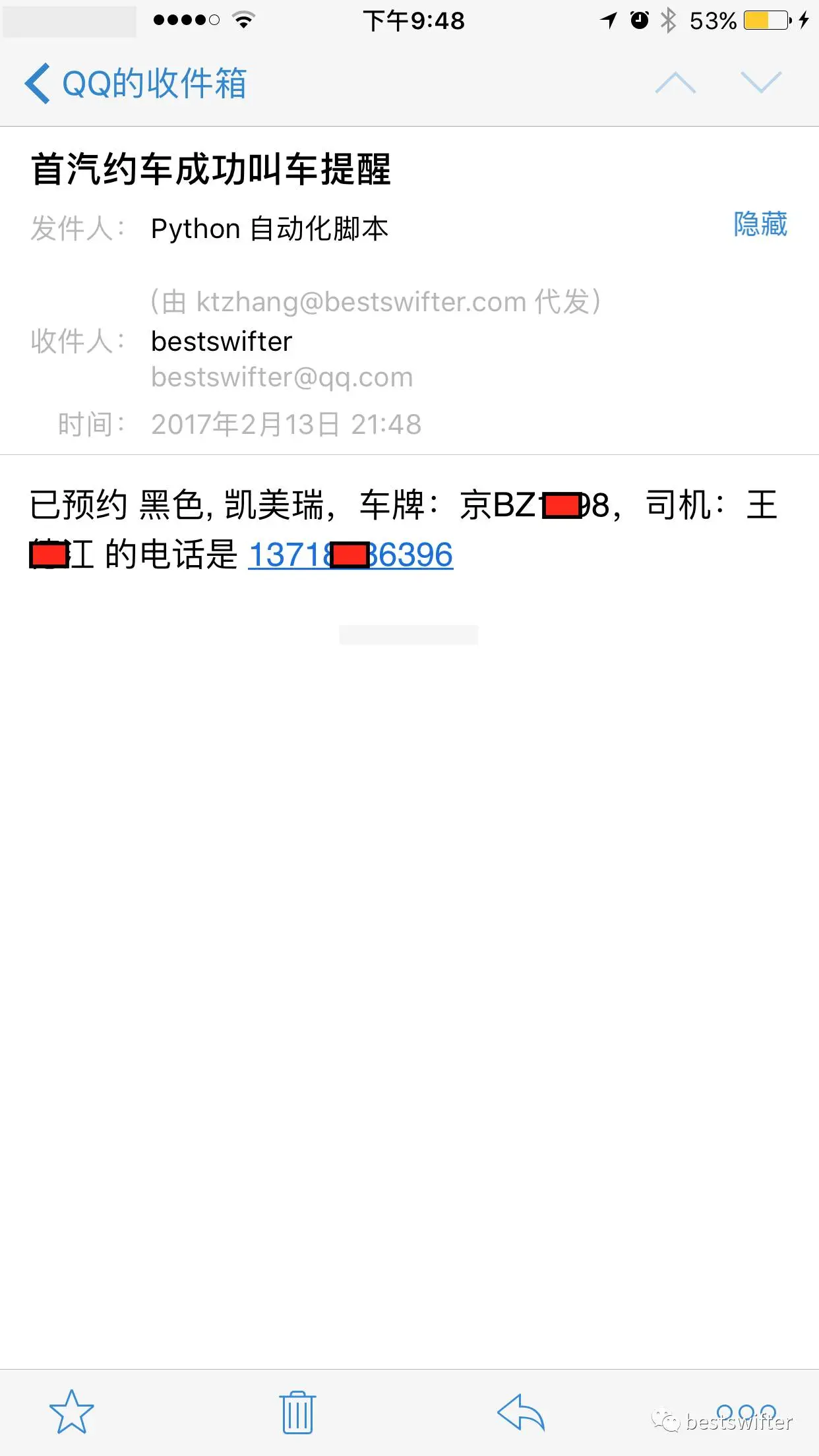 当然后续可做的功能还有很多,比如叫到车以后司机位置定时发送,更用户友好的邮件提示,提前半小时开始预约等等。不过这样就违背了自己 提高效率 + 学习 Python 的初衷,因此暂时不会考虑实现这些功能。