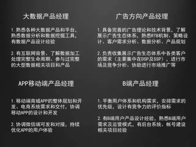 在深度分析A和B的职业发展路径前,我们选取了企业对大数据产品经理、广告方向产品经理、APP移动端产品经理、B端产品经理发出的JD,删减产品经理的必备技能后,总结企业对这四类产品经理的核心要求——