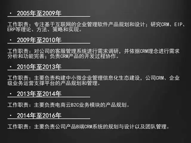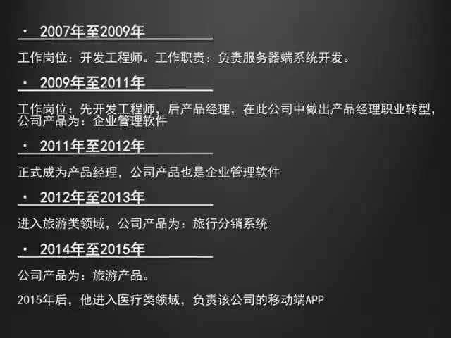 A毕业于2004年,普通本科,2005年来到北京开始从事产品经理岗位。