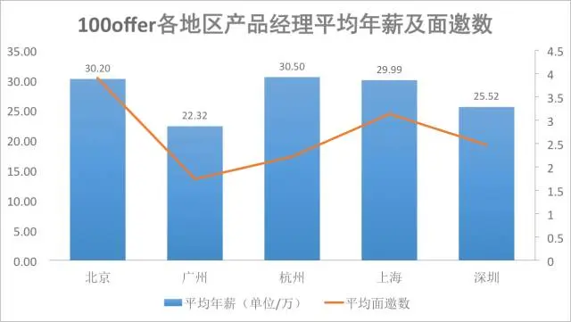 在过去的一年里,北京区域的HR们在100offer上对产品经理共发出2921封面试邀请,平均面邀薪水为30.2w,每名产品经理收到的平均面邀数为3.9,对比其他城市,北京产品经理的平均薪水排在第二,获得平均面邀数排在第一。