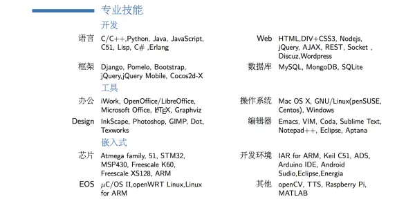 就是要把你玩过的、觉得很 High 的东西都往上写。毕竟大部分人都是玩游戏过来的,然后你还玩过这么多东西,面试官对你的印象一定特定好。不过,还是那一点,不要造假——写到简历上的东西,都会成为你的呈堂证供。作为一个 Play for Fun 的程序员,谁的大家不是这么玩过来的。