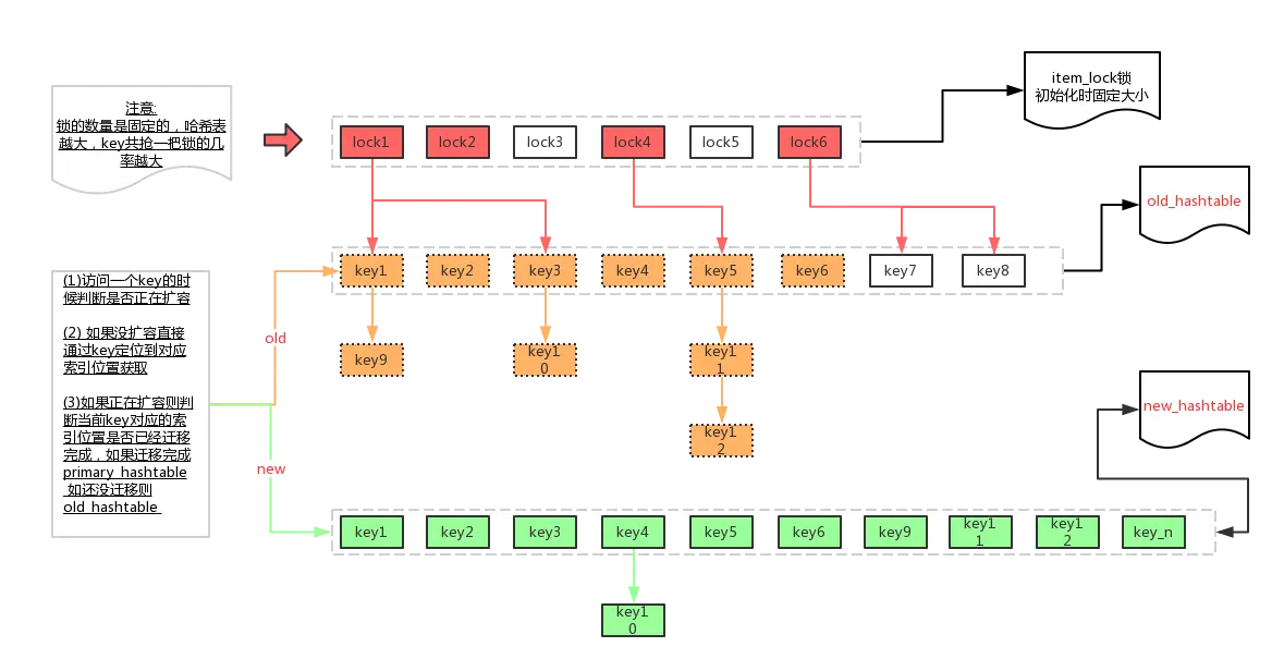 在 hashtable 扩容的时候 memcache 会把当前 primary_hashtable (哈希表)复制一份给 old_hashtable(哈希表),然后对 primary_hashtable 进行扩容 (1 << hashpower + 1),如果当前正处于 hashtable 扩容阶段, 同时有请求要访问 key,则会判断当前的 key - hash 之后的索引位置是否小于当前迁移的索引位置,如果小于则代表已经迁移到新的