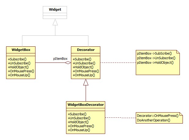 很简单!能在不改变现有系统结构的情况下,增加一种新的操作方式。那么我就实现一个装饰类,在其中嵌入已经存在的控件类WidgetBox,然后我在装饰类中实现自己的各种操作方式,而且用到大部分的WidgetBox类本身已经实现的功能。