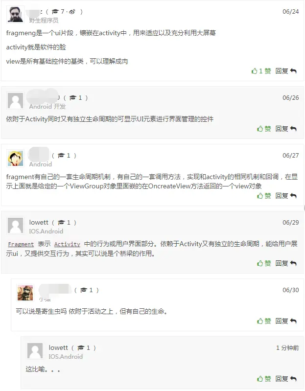 记得有次我去面试,面试官问我:对于平日使用的Fragment你如何理解的?这一问一下子蒙圈了,虽然平日经常使用但是从来没有想过这么深的问题。这里也顺便说一句,作为开发者去了解深层次的东西还是很有必要的,正所谓知其然,知其所以然。下面有张图是我在一家网站关于这个问题的提问,大家回复的见解。