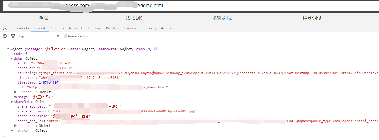 ok,到此,我们隐藏菜单按钮也能正常执行了,打开微信web开发者工具控制台,截图如下: