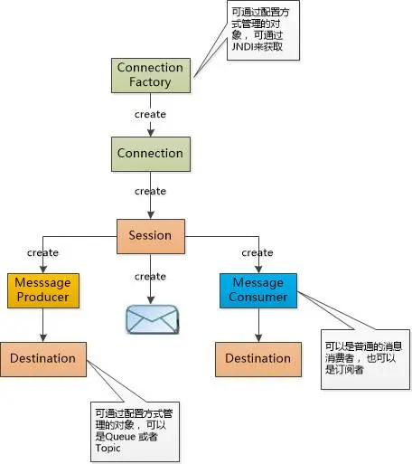“不错, 其实消息生产者/消费者也应该由Session来创建,因为他们要发送/接收消息肯定是在一个会话中, 另外你想想, Session对象由谁来创建?”