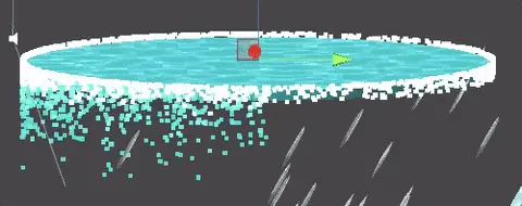 其中,掉落水滴的粒子是使用一个大的圆形发射器。我还将前面的粒子与后方粒子分开,后方粒子则是通过另一个粒子系统生成,放在180度的圆形模块上。后方粒子的颜色不变,且生命周期非常短,因为它们完全不可见。