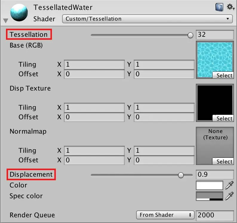 我们在Unity Manual中找到了简单易用的位移(Displacement)着色器,它还支持曲面细分(Tessellation),这样就不用担心几何问题了。将该着色器用于水材质后效果如下: