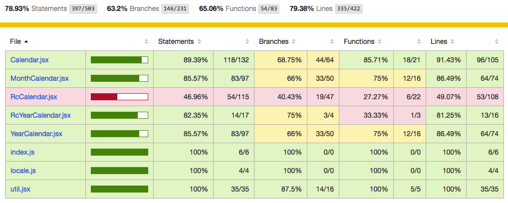 最后,怎么能更加清晰的知道自己哪些代码还没有覆盖到呢?如果可以看到就好了,能够对症下药,绝对提高覆盖率啊!当然,Karma 都帮你做好了,执行过 coverage 后会生成一个 coverage 目录,它的 src 目录下的组件文件命名的 html 文件打开后就会看到非常清晰的记录,红色的表示还没有覆盖到的。当然也可以本地起一个服务,可用 anywhere 直接浏览器里查看覆盖率列表和对应的详细文件。下图是一份coverage 报告。