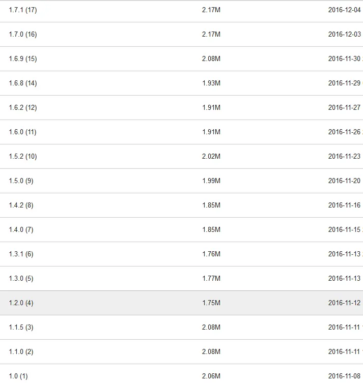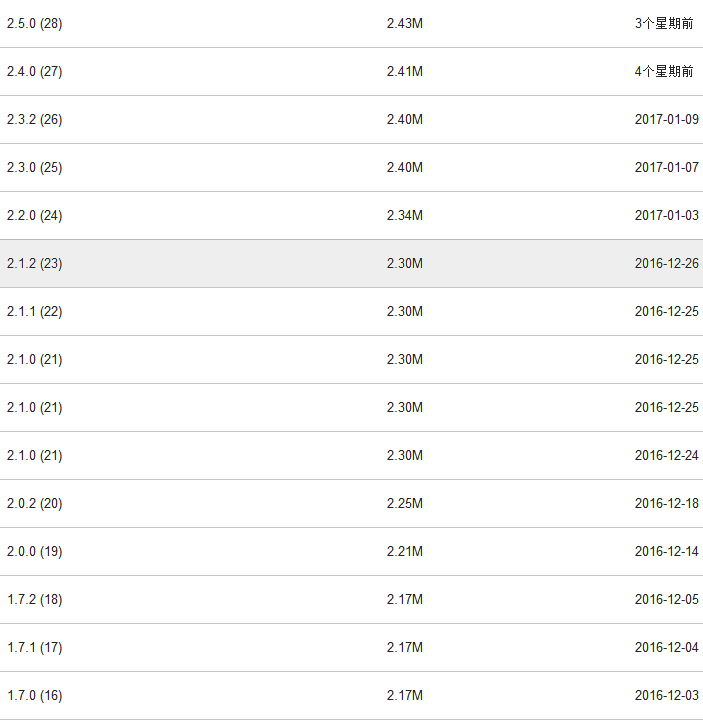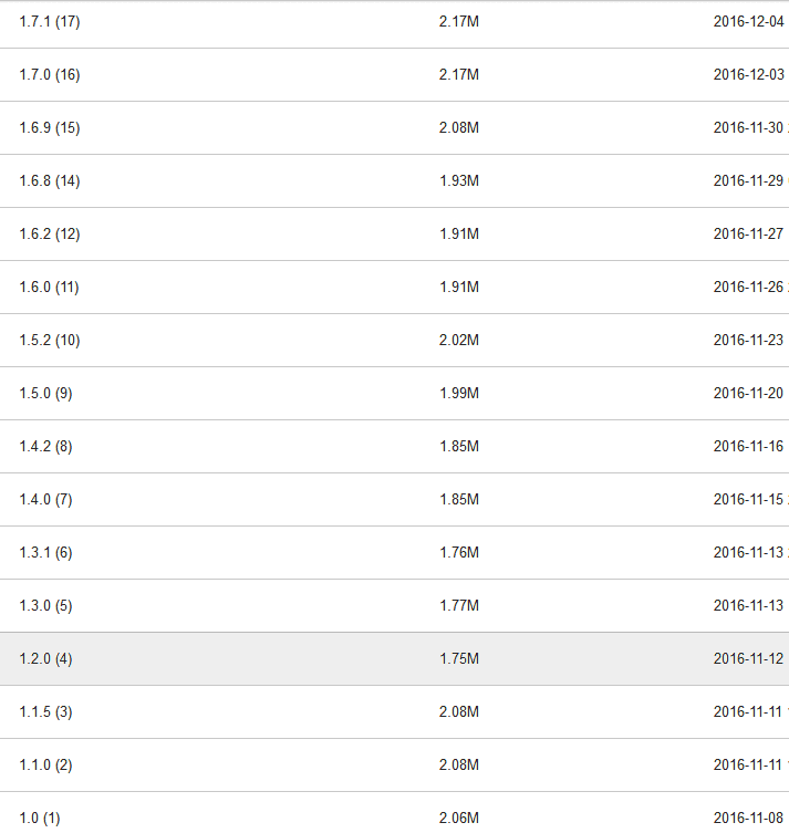这些功能看起来不多,真做起了还是相当折腾人的。为了把新功能尽快发布出去,我们以极高的频率发布新版本——在2.0.0版以前,基本上每周会发布2-3版,2.0.0以后也基本上保持了一周一版。截止2月9日,我们一共发布29个版本,往git上提交了300多次,总共30000多行有效java代码。下面两张图是酷安的应用发布后台,真实记录了我们每一次发布(2.6.0没在里面)。