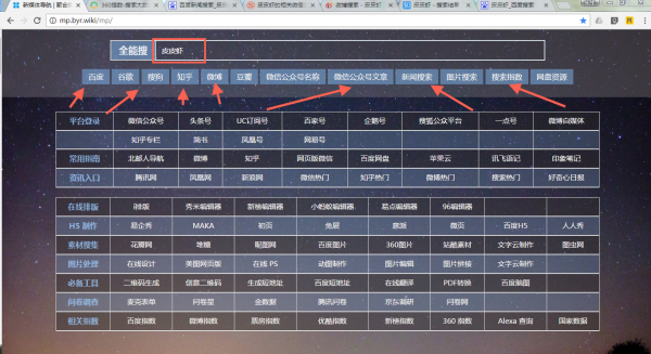 而现在,在这个导航页顶部的搜索框,输入关键词之后,可以直接选择下面要检索信息的平台,一键直达。