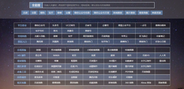 整合了新媒体运营人员、自媒体人从业人员常用的各种在线站点,工具等,不用再去收藏夹里一个一个的找啦,也不用去搜索引擎里一个一个的搜出来了。现在只需要一个就能搞定。