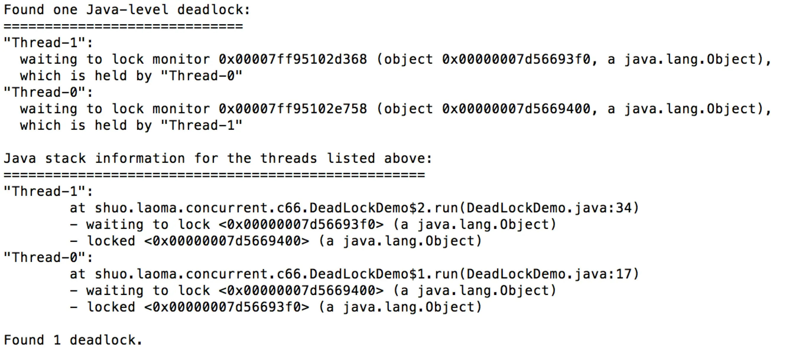 如果还是出现了死锁,怎么办呢?Java不会主动处理,不过,借助一些工具,我们可以发现运行中的死锁,比如,Java自带的jstack命令会报告发现的死锁,对于上面的程序,在我的电脑上,jstack会有如下报告: