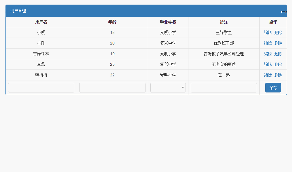 { Id: 2, Name: '小刚', Age: 20, School: '复兴中学', Remark: '优秀班干部' },