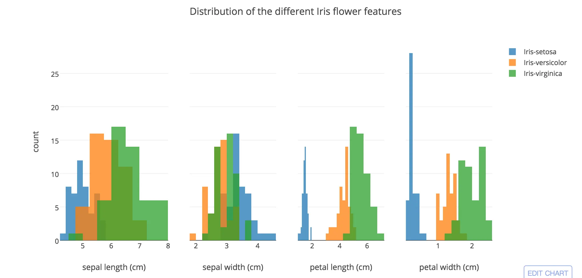 我们下一步是来看3类型的花怎么分布在4个特征上,我们可以通过直方图来展示