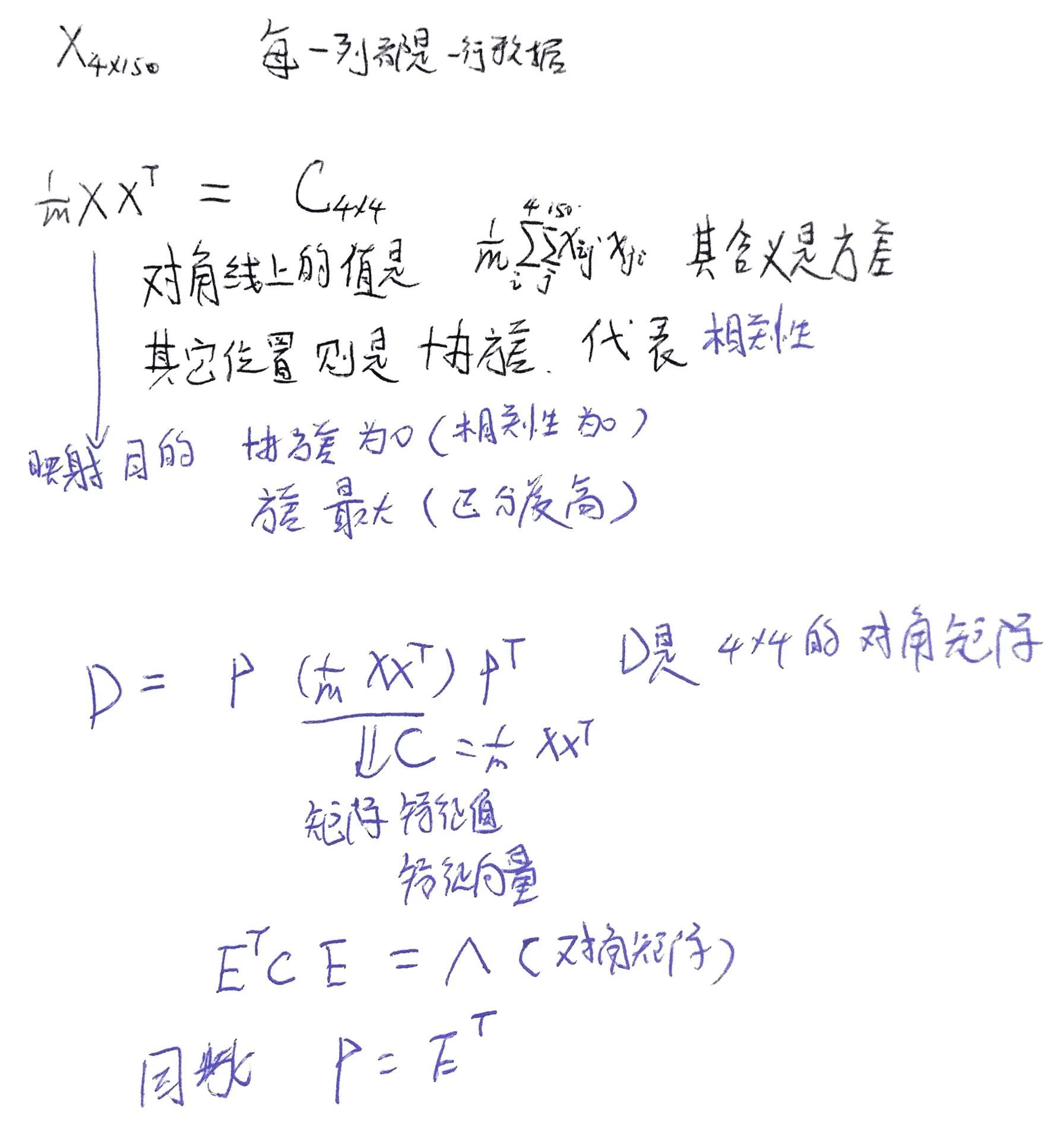 - 假设 C = 1/150 X T(X), 则C是一个对称矩阵,而且是 4 * 4 的,其对角是各个字段的方差,而第i行j列和j行i列元素相同,表示i和j两个字段的协方差。